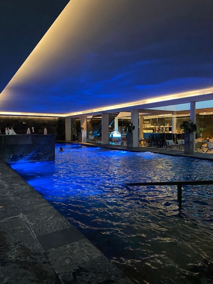 Découvrez notre coin aquatique avec piscine et spa d'intérieur.